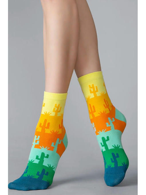 Хлопковые носки унисекс средней высоты выше щиколотки с красочным дизайнерским принтом в виде кактусов. Удобная резинка обеспечивает идеальное облегание, а кеттельный (плоский) шов на мыске создает дополнительный комфорт. Яркие, оригинальные и насыщенные — эти носки производят настоящий wow–эффект, привлекают внимание и выглядят очень стильно