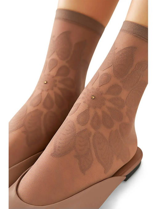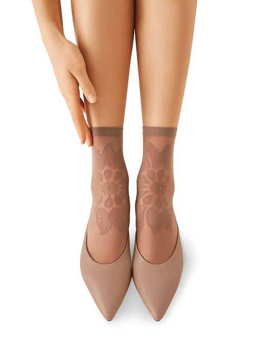 Тонкие фантазийные носки плотностью 20 ден, с невидимым усиленным мыском и комфортной широкой резинкой. Фронтальная часть модели декорирована кружевным ажурным узором со стразами по центру