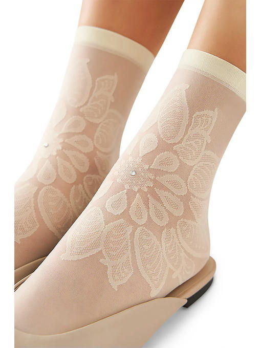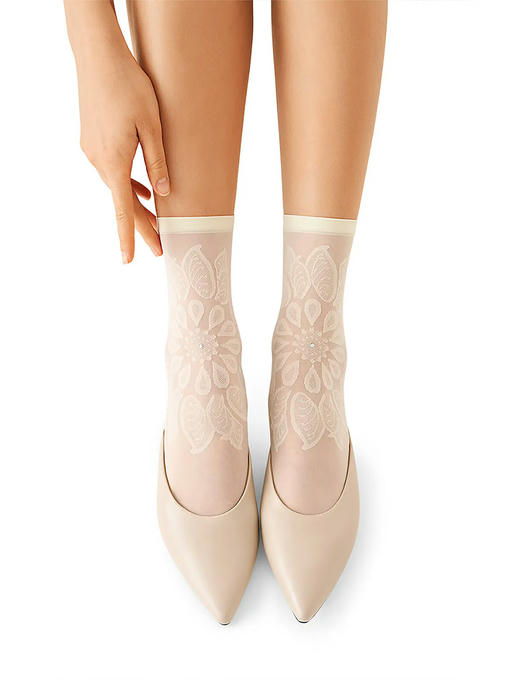 Тонкие фантазийные носки плотностью 20 ден, с невидимым усиленным мыском и комфортной широкой резинкой. Фронтальная часть модели декорирована кружевным ажурным узором со стразами по центру