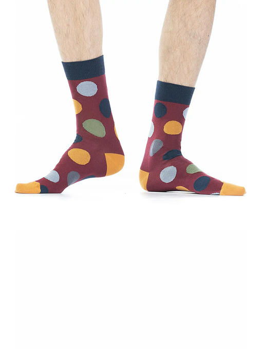 Хлопковые мужские носки с контрастным дизайном резинки, мыска и пятки. Вся модель декорирована ярким рисунком “крупные разноцветные кружочки”
