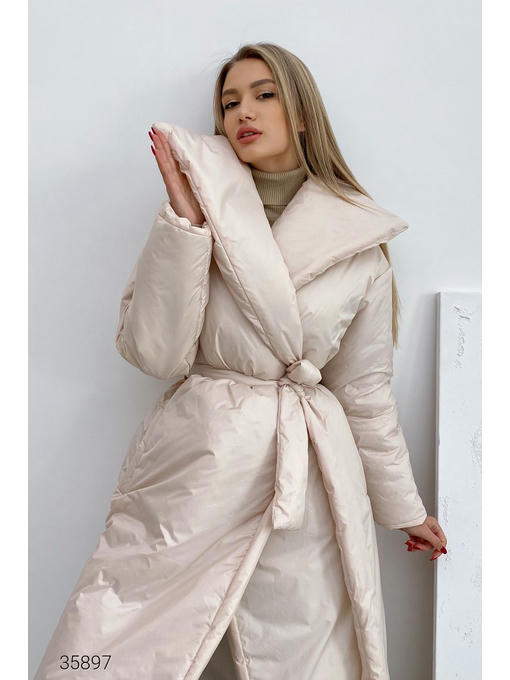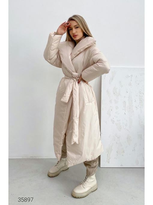 Дутое пальто в стиле оверсайз. Объёмный отложной ворот, заниженная линия плеч, боковые карманы. Есть подкладка, в комплекте пояс. Размер универсальный, подходит на 42 – 48.