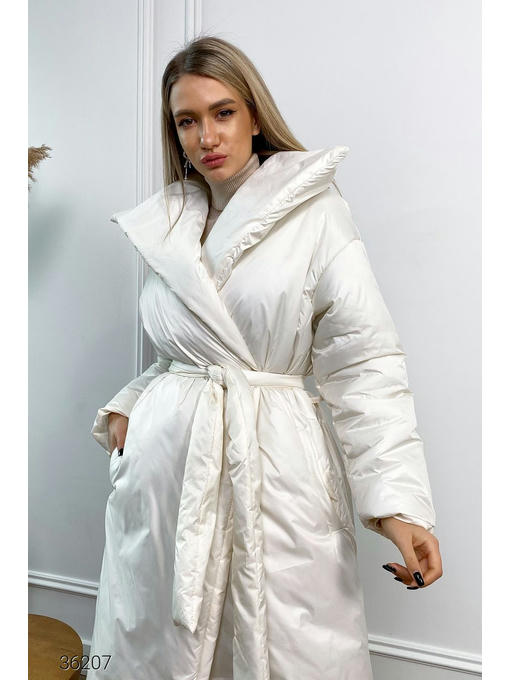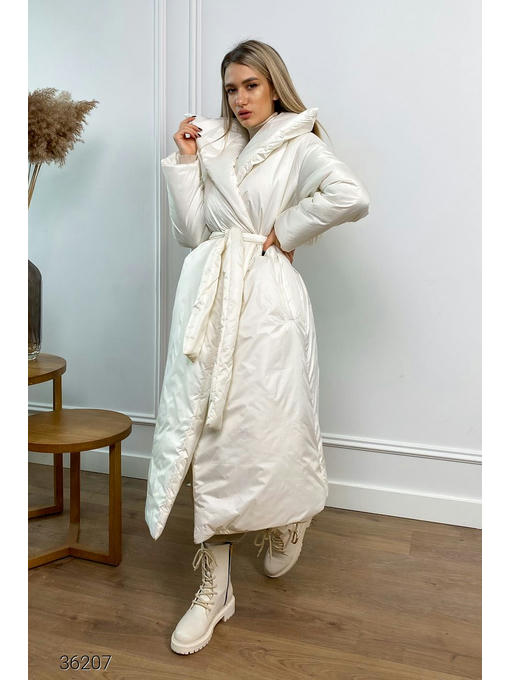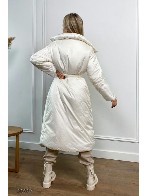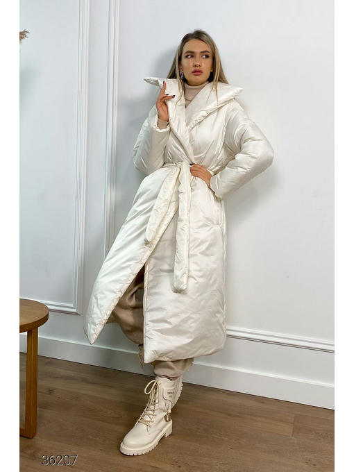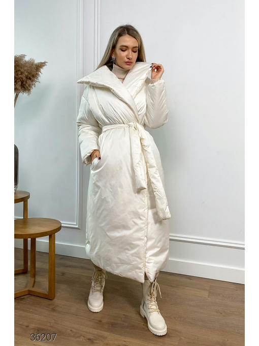 Дутое пальто в стиле оверсайз. Объёмный отложной ворот, заниженная линия плеч, боковые карманы. Есть подкладка, в комплекте пояс. Размер универсальный, подходит на 42 – 48.