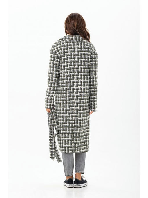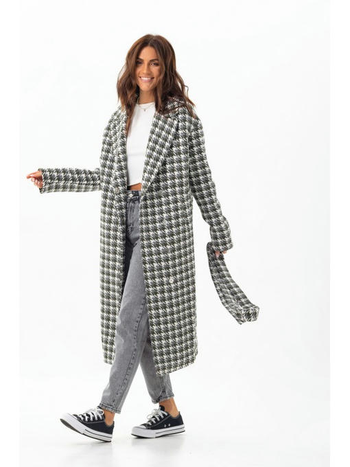 Пальто в лапку длиной миди. Модель прямого кроя, со спущенными рукавами. На рукавах есть манжеты, поэтому длину рукава можно регулировать. Английский воротник создает V-образный вырез. На лицевой части пальто нет фурнитуры, застегивается потайными кнопками. Пальто дополнено поясом. Изюминка пальто – невероятная шерстяная ткань с узором в цветную лапку.
