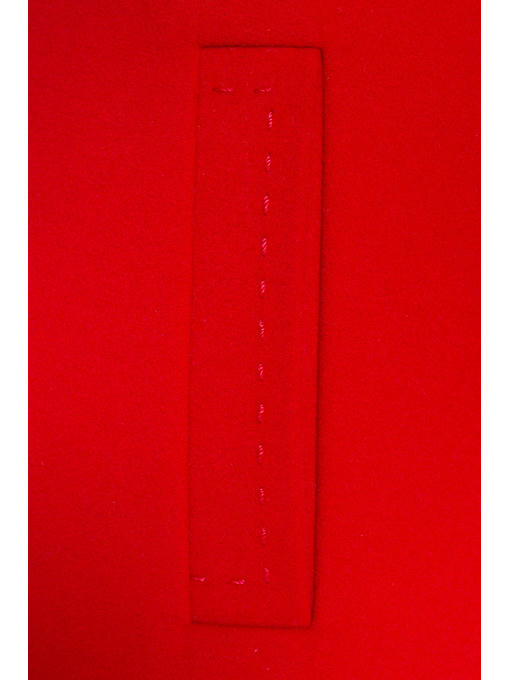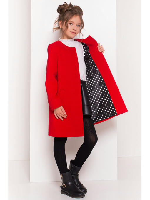 Пальто -трапеция со скрытыми застежками-кнопками. Горловина округлая. Модель рассчитана под шарф. Рукав стандартный. По бокам – прорезные карманы. Края изделия обрамлены декоративной строчкой. Внутри – яркая подкладка с принтом горох.