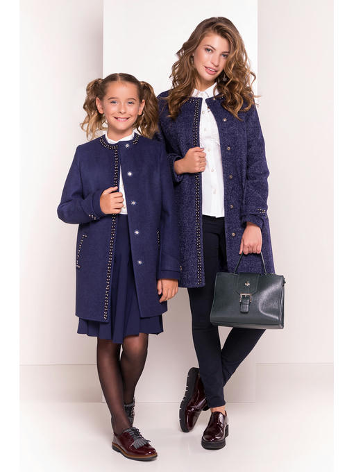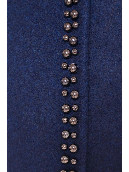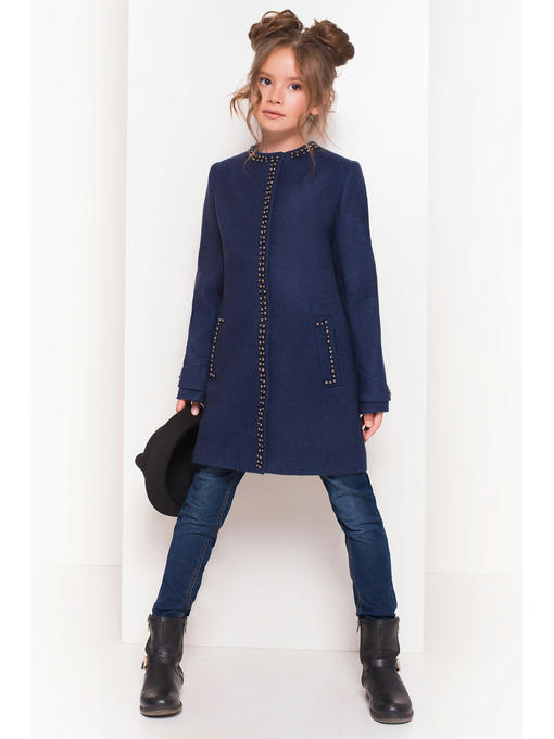 Детское пальто – трапеция с декором – бусинами. Стандартный рукав, декоративные манжеты. По бокам – прорезные карманы украшенные бусинами. Застегивается на скрытые кнопки. Горловина и планка так же с россыпью бусин.