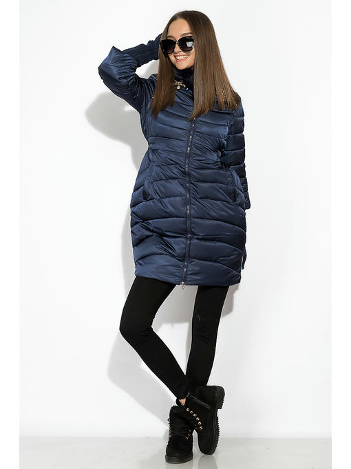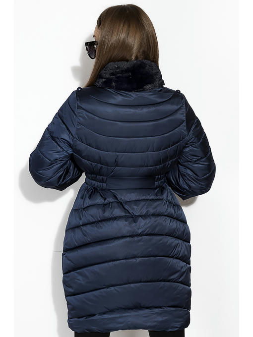 Длинная женская, стеганая куртка с рукавом три четверти, имеет отделку воротника, выполненную из искусственного меха, и пришивной яркий декор в области плеч. Приталенный силуэт изделия обусловлен наличием резинки по талии. Дополнительный комфорт обеспечивают два боковых кармана на молнии и входящие в комплект вязаные рукава-манжеты. Центральная застёжка на тракторную молнию с двумя бегунками, предоставляет удобство в использовании.