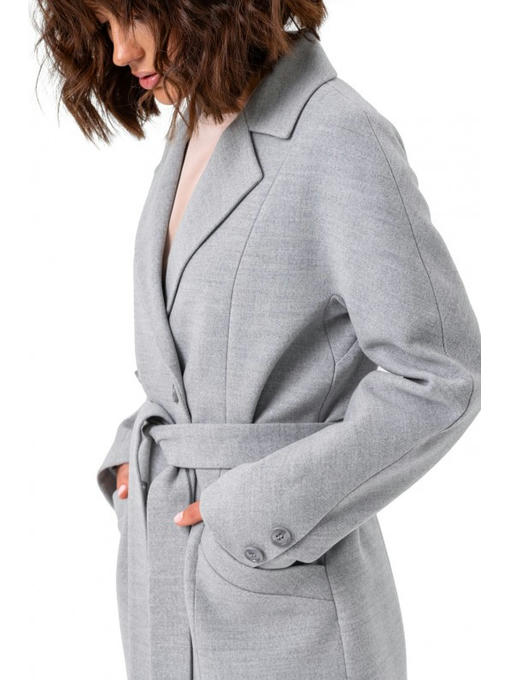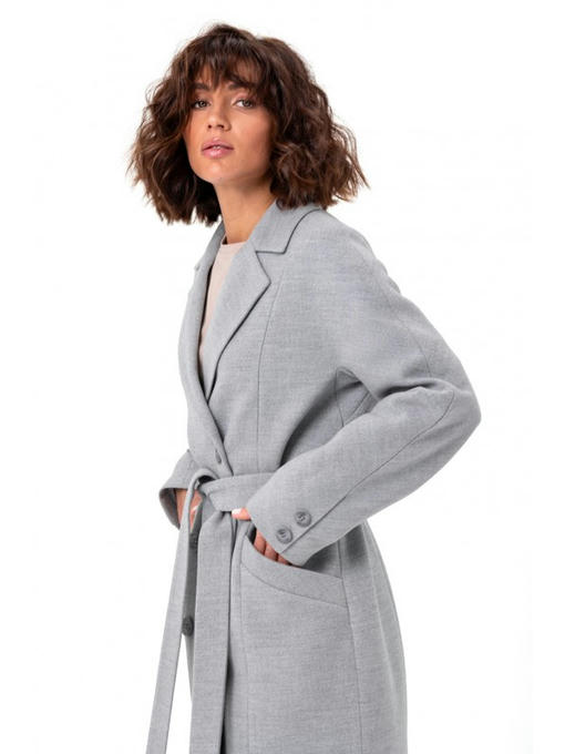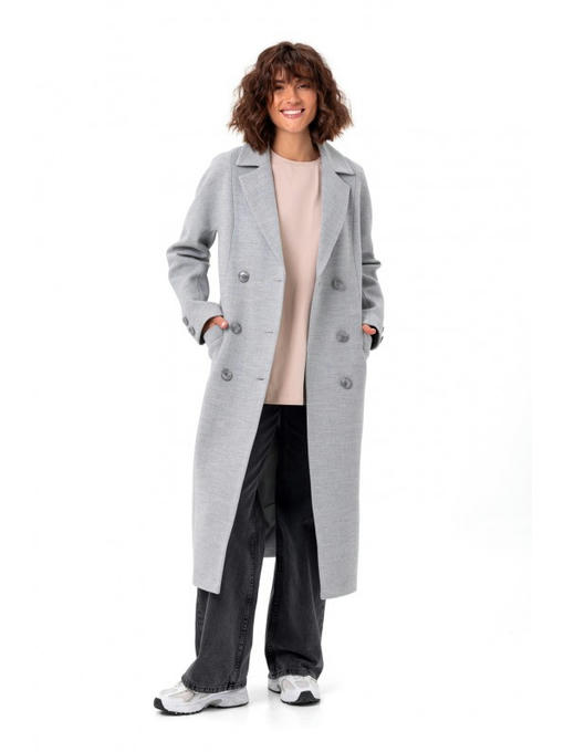 За счет горизонтальных швов прямое пальто вытягивает силуэт, визуально прибавляя рост. Двубортное пальто имеет пару прорезных карманов, шлицу сзади. Застёгивается пуговицами. В комплекте пояс.