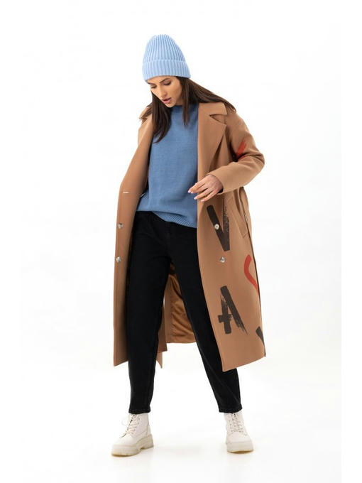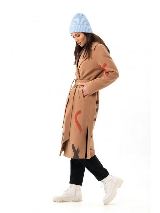 Пальто с дизайнерским рисунком как нельзя лучше подчеркнет вашу индивидуальность. Рисунок нанесен на ткань методом сублимации, краска впечатывается в ткань, поэтому принт не линяет и не выстирывается. Изделие свободно ложится на фигуру, хорошо сочетается с любым низом и типом обуви. Основная ткань – кашемир. Спущенная линия плеча. Английский воротник. Вместительные прорезные карманы. На лицевой стороне есть 2 внешние пуговицы. Модель застегивается кнопками. На уровне талии предусмотрены шлевки для пояса. По бокам – эффектные разрезы.