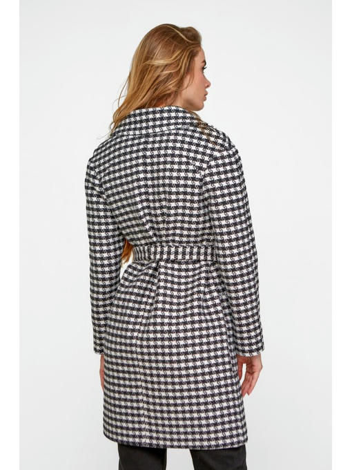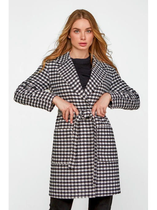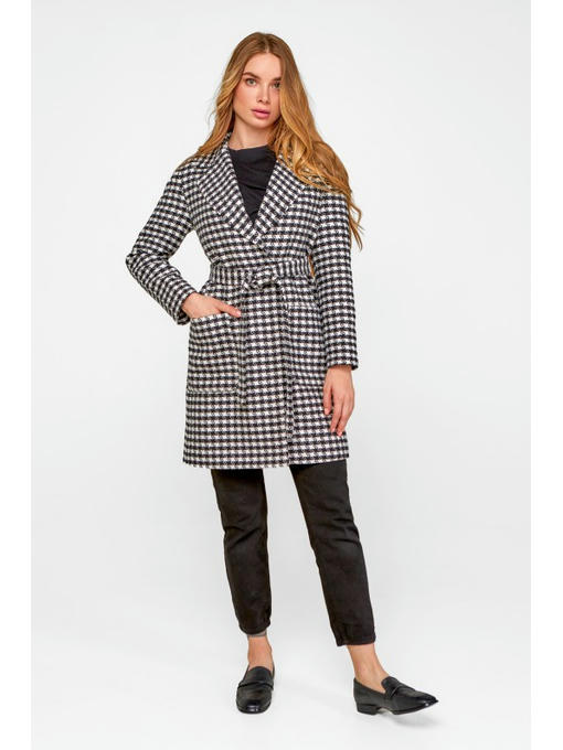 Пальто с накладными карманами рассчитано на весну-осень. Модель прямого кроя, сшитая из шерстяной ткани с узором лапка. Английский воротник. Спущенное плечо. Вместительные накладные карманы. Длина модели —выше колена. Застежка —потайные кнопки. Пальто особенно эффектно смотрится с поясом.