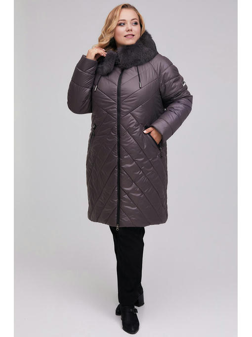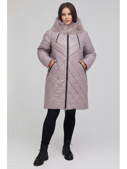 Пальто со съемной опушкой из крашенного кролика прямого силуэта. Выполнено из плащевой ткани :спинка-стежка ромб, передняя полочка-стежка полоска. Капюшон вшитый со стойкой. Рукав-реглан. Карманы на молнии втачные. Изделие застегивается на центральную молнию. Утеплитель микропух 100+слимтекс 60