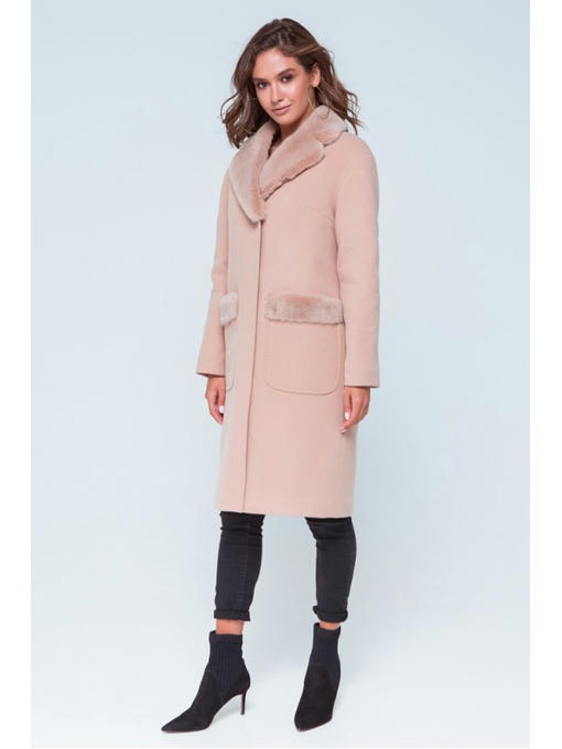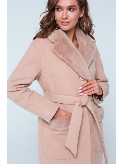 Модель застегивается кнопками. Под воротником расположена внешняя пуговица, в цвет пальто. Воротник отложной со вшитым меховым воротником из норки. Аналогичный мех украшает накладные карманы. Длина пальто универсальна – по колена. Есть пояс.