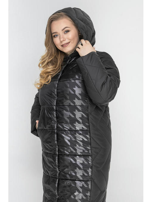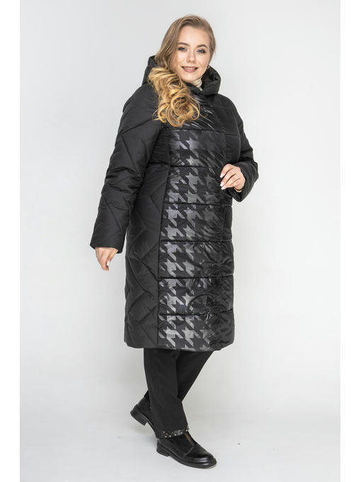 Пальто прямого силуэта из двух видов ткани:плащевка стежка зигзаг и плащевка принт гусиная лапка. Капюшон вшитый с регулируемой кулиской. Втачной рукав. Карманы в шве на потойной молнии. Утеплитель микропух 100+слимтекс 60. Застегивается на молнию и кнопки.