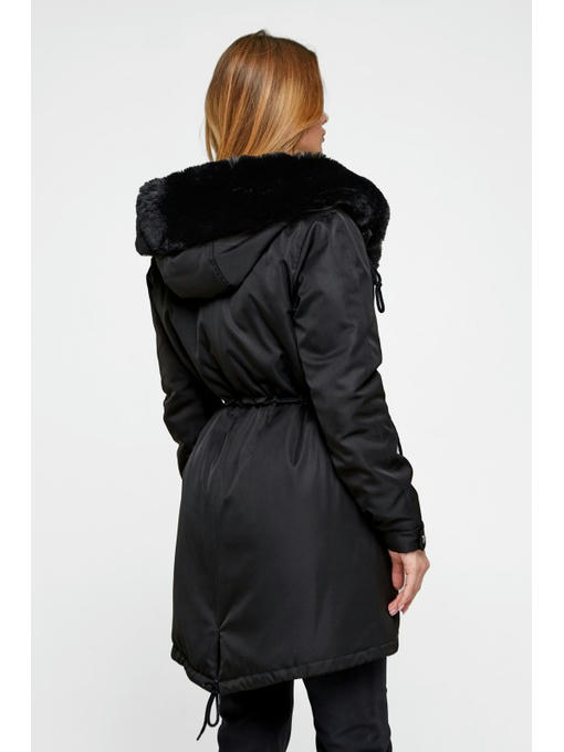 Модель застегивается с помощью молнии, спрятанной под планкой на кнопках. Искусственный мех – отстежной. Капюшон глубокий и удобный. Низ спинки выполнен в виде так называемого : длина спинки заметно длиннее переда, низ спинки раздвоен и соединен декоративной веревкой.