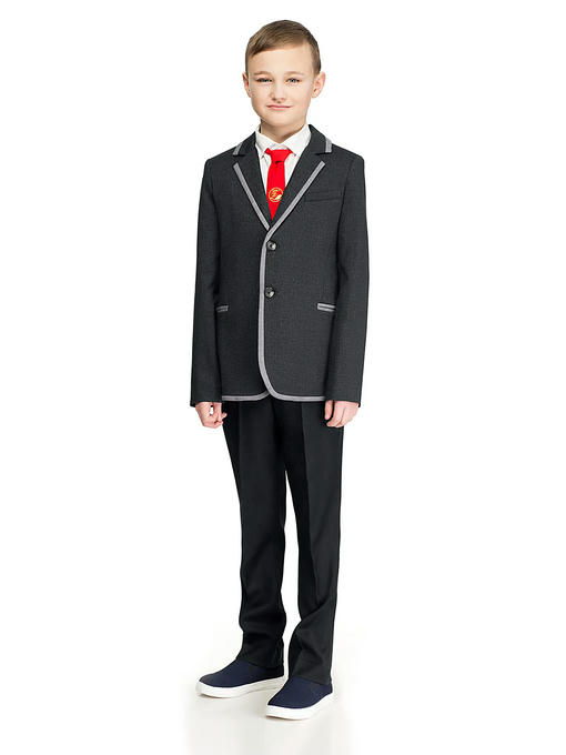Строгий пиджак для мальчика из трикотажного полотна на вискозной подкладки. Пиджак полуприлегающего силуэта, удлиненный, с центральной застежкой на две петли и пуговицы до перегиба лацкана.Детали переда с отрезными бочками, передними вытачками и боковыми прорезными карманами в рамку. На левой детали переда верхний прорезной карман с листочкой. Спинка со средним швом, заканчивающимся шлицей. Рукава втачные двухшовные, локтевые швы заканчиваются шлицами. На шлицах по четыре отделочные петли и пуговицы. Воротник пиджачного типа с тупыми концами. Пиджак с притачной по низу подкладкой. На деталях подкладки обработан внутренний карман и вешалка. Край воротника, лацкана, борта обработан притачным кантом