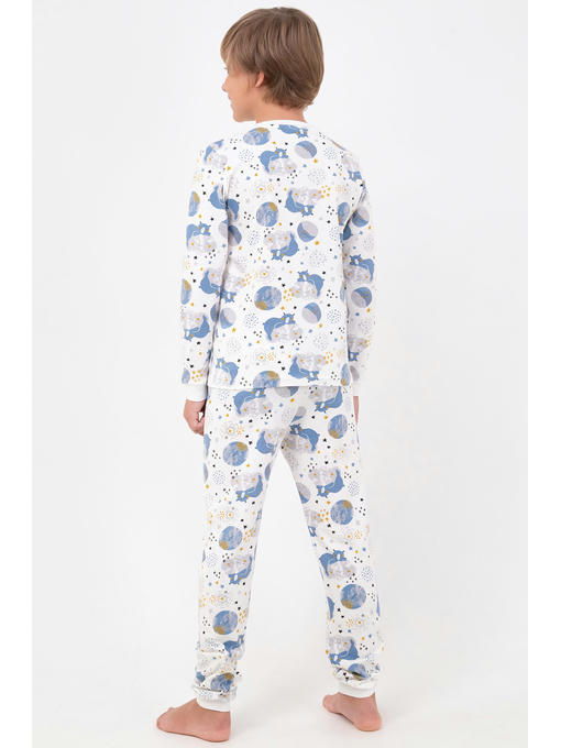 Мягкая пижама для мальчика сшита из трикотажа кулирная гладь. Приятный на ощупь хлопок с добавлением безопасных синтетических волокон позволяет нежной коже дышать, прекрасно держит форму, не вытягивается, сохраняет цвет даже после многочисленных стирок. Домашний костюм выполнен в белом цвете и украшен милым принтом мишка на облаке.