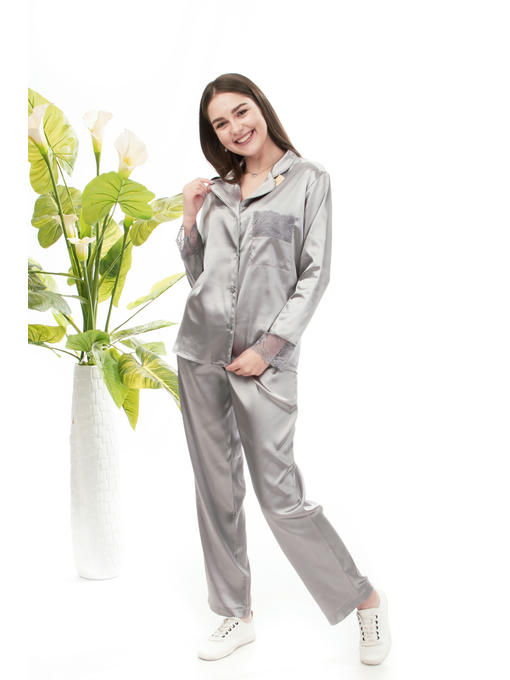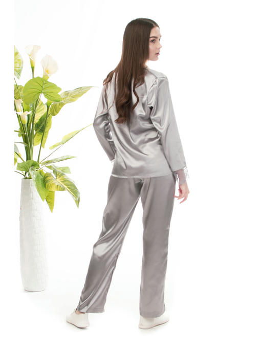 Пижама из стрейч атласа, цвет серебристый. Кофта с длинными рукавами и кармано и брюки. Очень приятная, качественная ткань.