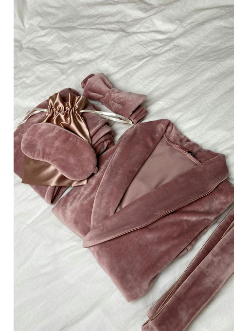 Жакет прямого силуэта длиной чуть ниже середины бедра.Брюки прямые свободные классической длины.На поясе брюк внутренняя широкая резинка.На жакете воротник-шаль.Рукав на жакете слегка спущенный.С декоративным отрезным манжетом.Накладные карманы также с отрезным манжетом.Пояс съемный из основной ткани,декорирован также атласным кантом, в комплекте с костюмом имеется маска для сна,аксессуар для волос-чалма и мешочек для аксессуаров.Такой костюм-пижама идеально смотрится дома-в нем можно встречать гостей,блистать на пижамной вечеринке,комфортно спать.И в тоже время этот костюм очень стильно и непринужденно будет выглядеть на прогулке.
