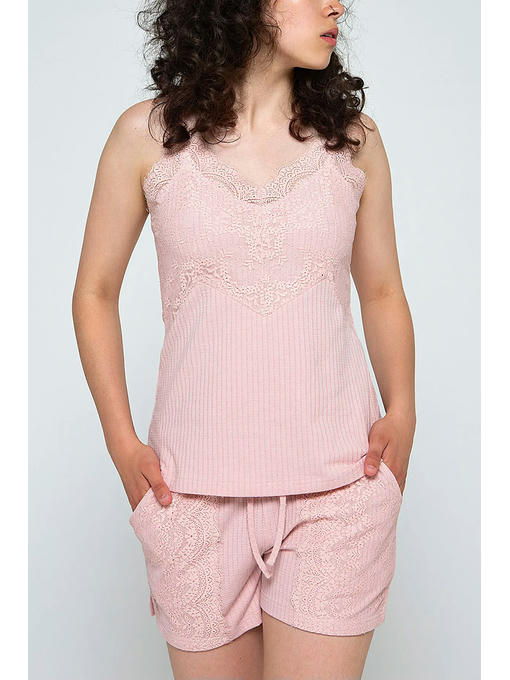 Женская пижама: топ и шорты, из хлопкового трикотажа «в рубчик», цвета пыльной розы. Шорты на резинке, дублированной шнурком. Удобные боковые карманы. Разрезы по бокам, чтобы шорты не стесняли движений. Топ на шелковых регулируемых бретелях. Комплект щедро украшен широким кружевом в цвет основной ткани. Роскошная вещь для Вашей спальни