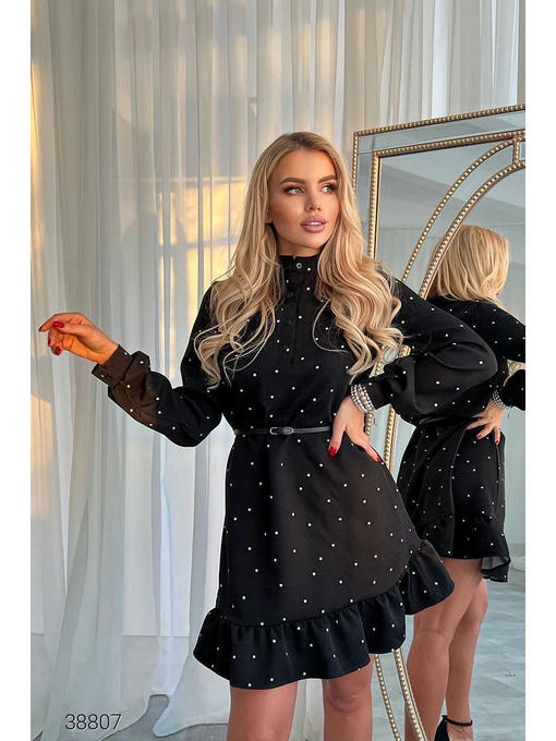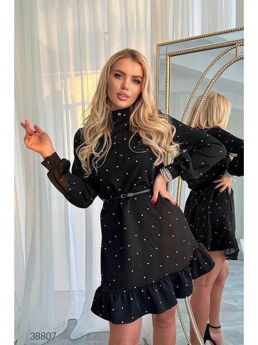 Платье свободного А – силуэта из качественного костюмного крепа. Ворот – стойка, объёмные рукава с манжетами на пуговице, планка на пуговицах. Нижняя кромка с отделкой оборкой. Ремень входит в комплект.