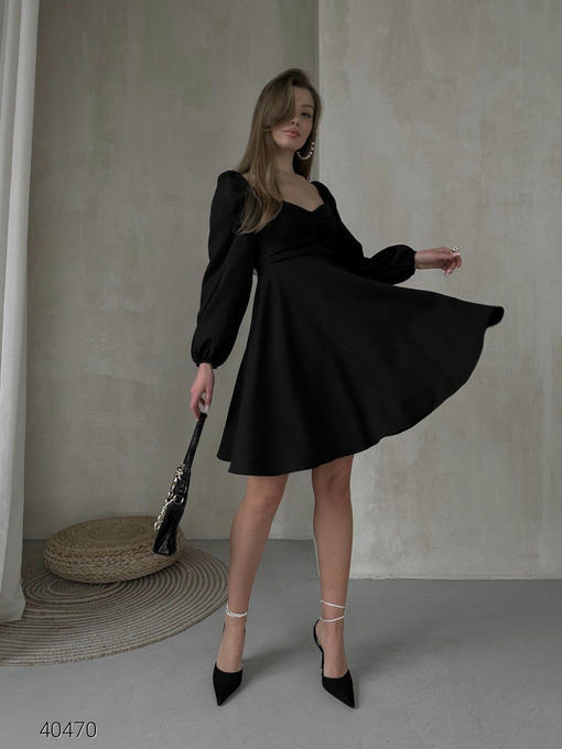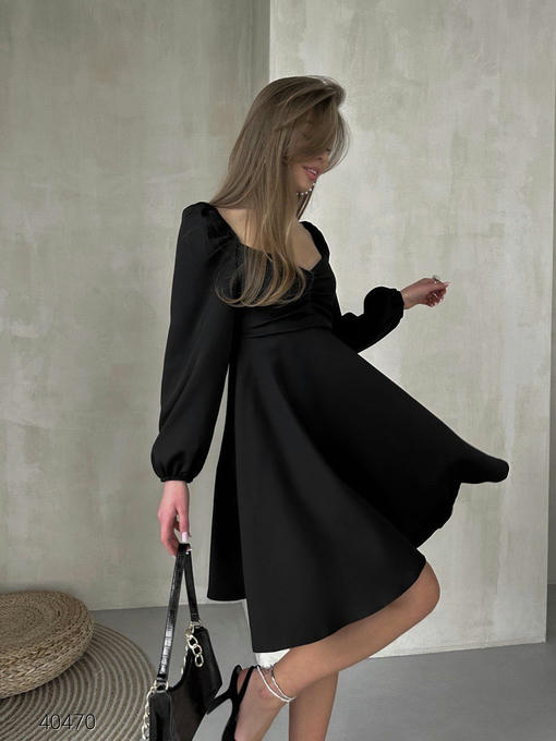 Платье с длинными рукавами. Рукава и плечики на резинке, в зоне декольте сборка. Застегивается на потайную молнию. Ткань: костюмный креп.
