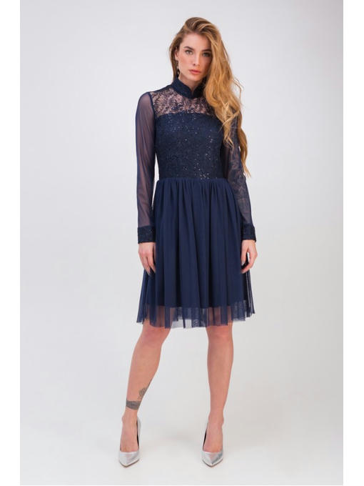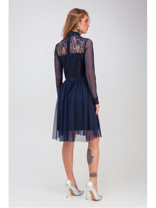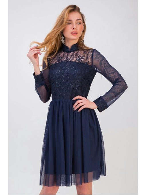 Платье с пышной юбкой позволяет почувствовать себя современной королевой. Легкое струящееся платье сделано из комбинации 3 тканей: гипюра – верх платья, сетки – для прозрачных рукавов с манжетом, фатина – для летящей юбки. Красивый штрих – воротничок-стойка. По спинке молния.