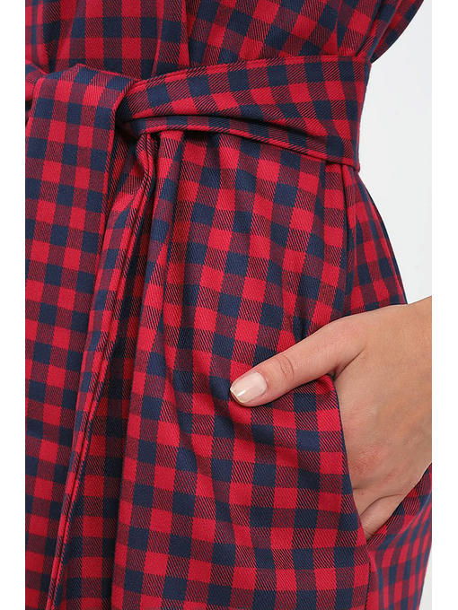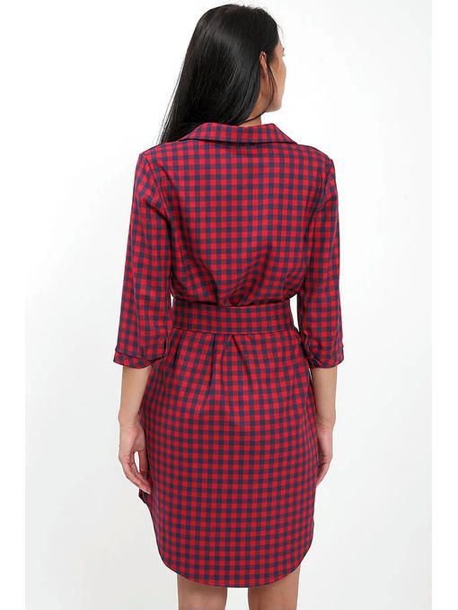 Платье-рубашка прямого силуэта. Выполнено из мягкой смесовой ткани . Втачной рукав 3/4 с манжетой по низу. Отложной воротник со стойкой рубашечного типа. В боковых швах выполнены карманы. Фигурная линия низа. Платье дополнено широким поясом из той же ткани. Длина платья увеличивается пропорционально размеру