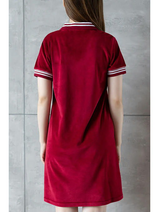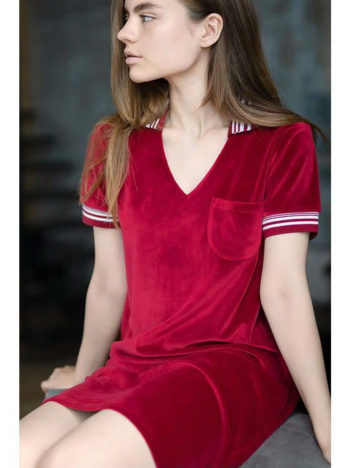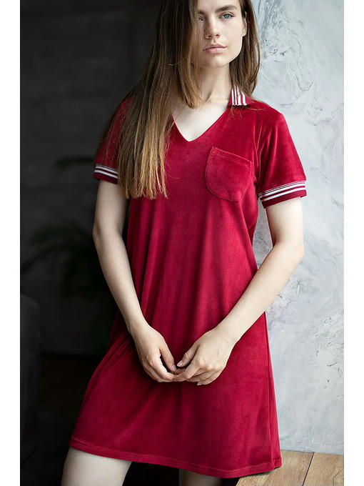 Женское платье из бархатного велюра, в спортивном стиле, выпущено в домашней коллекции OPIUM, но его с успехом можно использовать и по другому назначению, как одежду для прогулок и отдыха. Спортивный трикотажный воротничок и манжеты на коротких рукавах, нагрудный накладной кармашек, чуть расклешенный силуэт. Особое отдельное достоинство – это сочный и вкусный гранатовый цвет