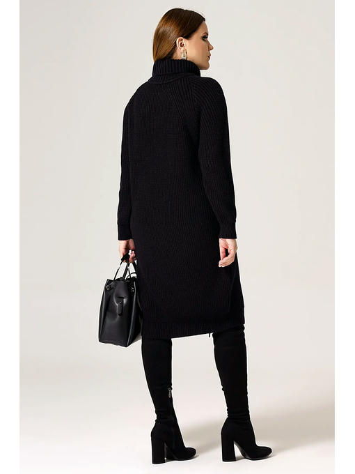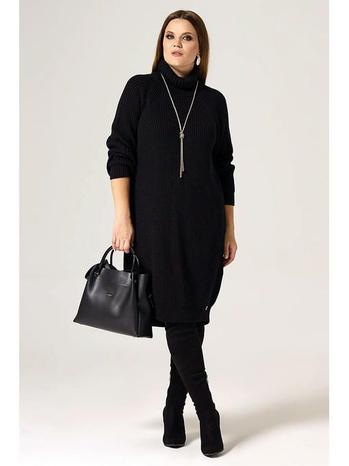 Вязаное платье длиной до коленей с длинными рукавами с широкими манжетами. Модель выполнена из мягкой пряжи на сочетании шерсти и акрила. Воротник – высокая стойка с отворотом.Модель фасона платья подразумевает свободную посадку. Такое лаконичное теплое платье легко разбавить различными аксессуарами, создавая разнообразные осенние образы