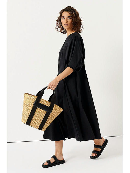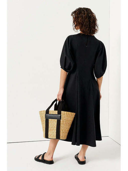 Полуприталенное платье длины миди, с рукавами-фонариками и свободной юбкой