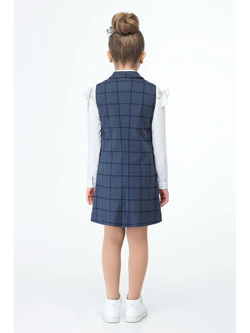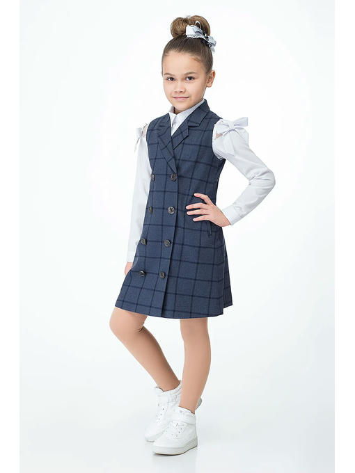 Модный двубортный сарафан для девочки из поливискозной ткани со стильным модным рисунком в клетку. Сарафан на поливискозной подкладки. Сарафан расширенного к низу силуэта, с V-образным вырезом горловины, с воротником пиджачного типа. По переду имеются карманы. Застежка центральная сквозная на петли и пуговицы. Сарафан отлично сочетается с различными блузками и джемперами, а иногда может быть в образе модного удлиненного жилета. Отличный вариант для дресс кода