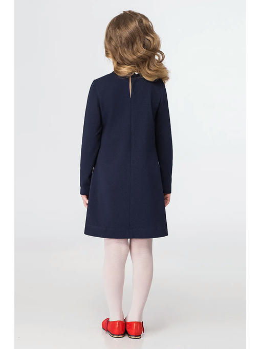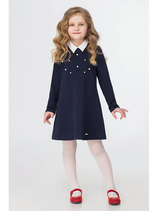 Модное платье для девочки из хлопкового трикотажного полотна со съёмным белым воротничком из смесовой сорочечной ткани. Платье расширенного силуэта, с длинными рукавами, с круглым вырезом горловины, с застежкой на петлю и пуговицу по спинки. По переду платье украшено бусинками. Отличный вариант как в школу, так и для повседневных дней