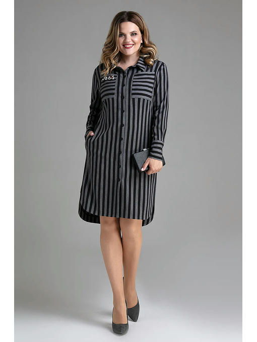 Осеннее стильное платье-рубашка-тренд этого года. Рукав рубашечный,чуть расширенный книзу и прихваченный на высокий манжет.Воротник рубашечный. Форма низа фигурная. Спинка длиннее переда.Трикотажные отрезные бочки дают свободу движениям и визуально стройнят фигуру.Застёжка по переду на кнопки.Два накладных кармана по переду.Правый карман декорирован пришивными стекло-стразами.Игра полоски привносит динамику в образ
