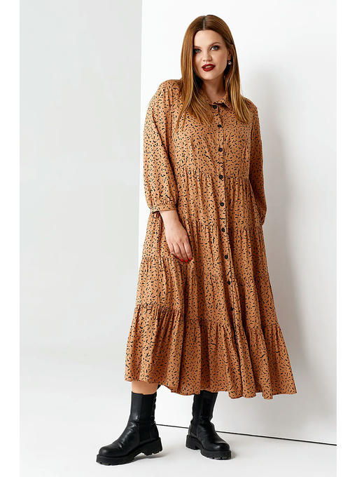 Женское платье-миди свободного кроя с оборками. Выполнено из 100% вискозы. Застёжка по переду на пуговицы. Отложной воротник-стойка