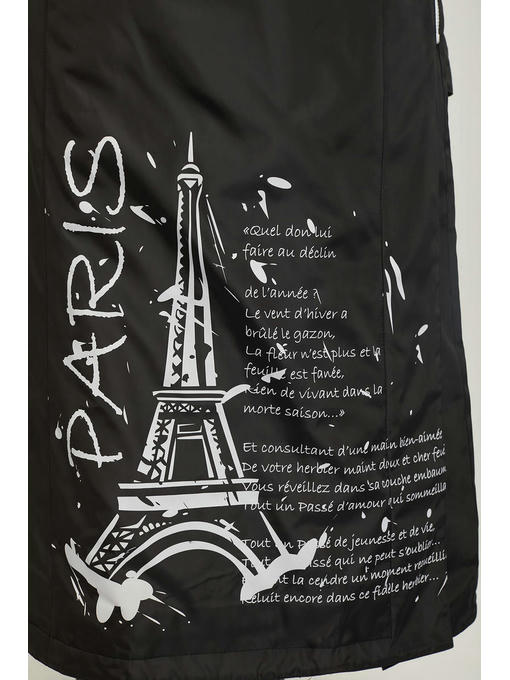 Удлиненный плащ прямого силуэта. На полочке накатка со стихами на английском и картинкой Эйфелевой башни. Плащ застегивается на косую ассиметричную молнию, длинна которой заканчивается ниже бедра. Модель пошита из водоотталкивающей плащевой ткани, подкладка из х/б. Наполнитель Slimtex60. Капюшон вшитый. По всей длине рукава проходит резинка и функциональная кулиска для затягивания длинны рукава. На изделии два втачных кармана. Цвета синий +белый(значит синий с белой змейкой), синий+красный(синий с красной змейкой)и т. д.