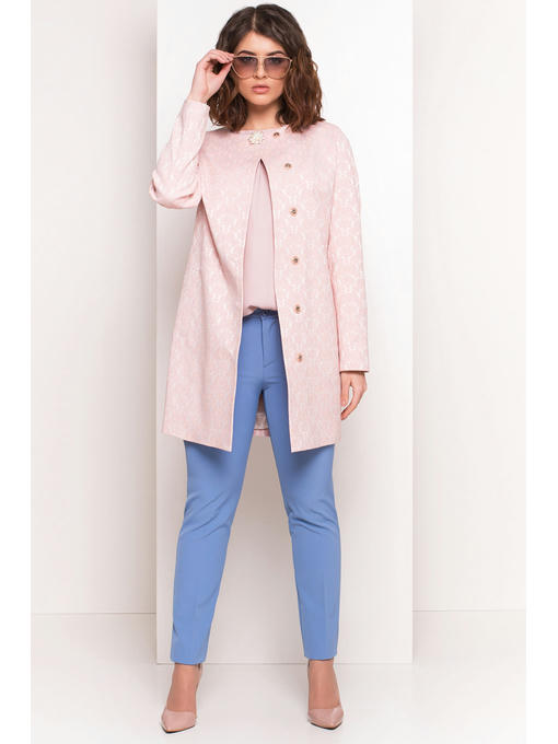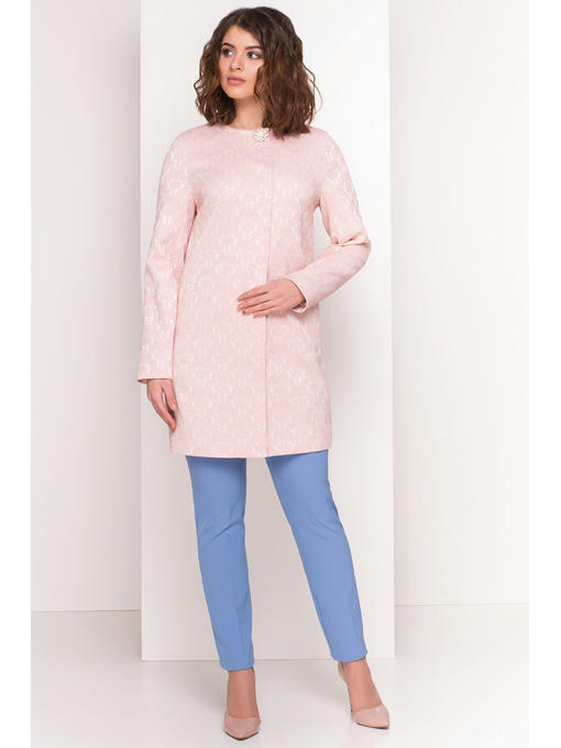 Плащ прямого кроя до середины бедра. Однобортный, с женственной округлой горловиной – лодочкой. Богатство жаккардовой ткани хорошо сочетается с лаконичностью кроя. Скрытая застежка на кнопках. По бокам – прорезные карманы.Довершает образ – брошь застежка у самой горловины.