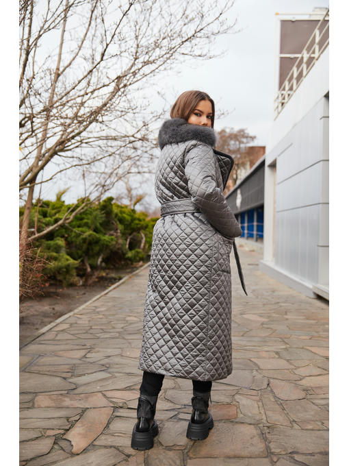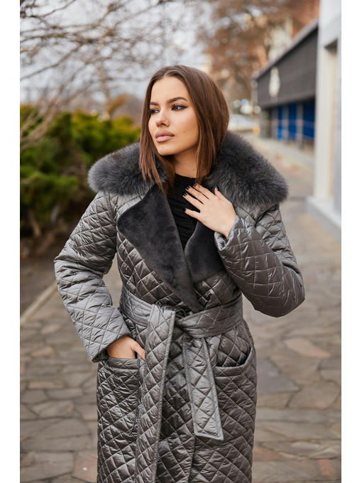 Серое стеганное пальто с поясом— лентой в комплекте, стилизовано лацканами, на кнопках. Воротник украшен комбинаций эко— меха и крашеного песца. Стеганные модели стали хитом сезона FW 2021/22. В своих коллекциях этот тренд поддержали такие модные дома, как Max Mara, Barbara Bui и Dior. Особенности: в роли утеплителя выступает – синтепон Обращаем внимание, что изделие рассчитано на температуру до— 10°С.