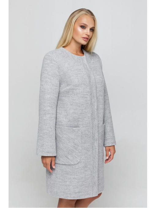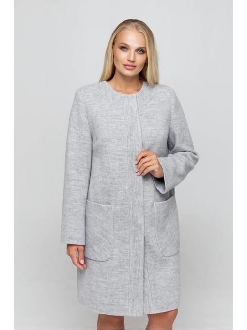 Полномерное пальто из трикотажа простое и элегантное. Прямой крой, круглый вырез, втачные рукава. Накладные карманы с закругленными углами. Длина пальто по колено. Застегивается кнопками.