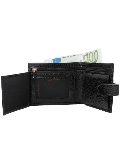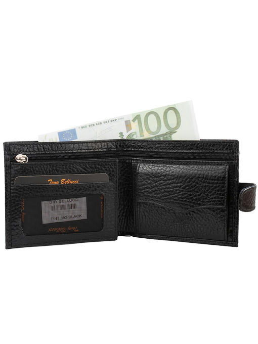 Кожаный кошелёк-портмоне чёрного цвета – беспроигрышный вариант для мужчины. Аксессуар из ассортимента TONY BELLUCCI подойдёт каждому, кто стремится подобрать практичный, компактный, стильный и надёжный кошелёк на каждый день. Модель в одно сложение выглядит безупречно, поскольку изготовлена из высококачественной натуральной кожи с точными параметрами каждой детали и крепкой прошивкой. Изделие плавно сгибается пополам, не деформируя купюры; внутри каждая плоскость несет функциональную нагрузку, и еще имеется откидная панелька. Широкое отделение на молнии для купюр (одно из трёх), плюс надёжный карман-монетница под клапаном на кнопке – то, что нужно для рационального размещения наличных денег