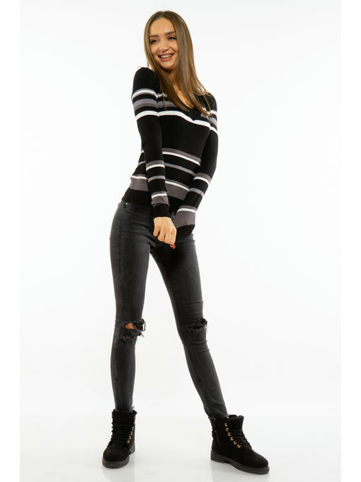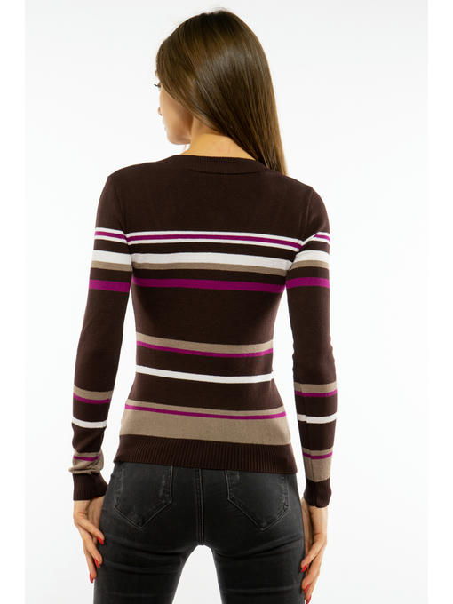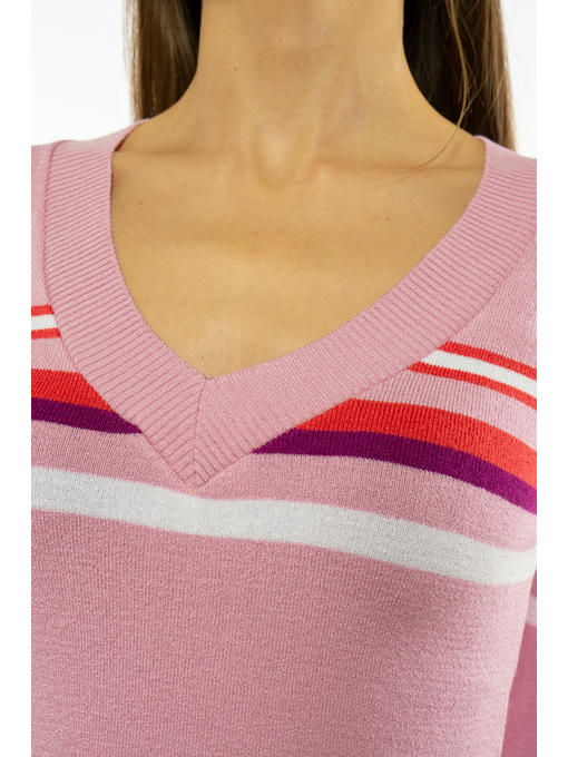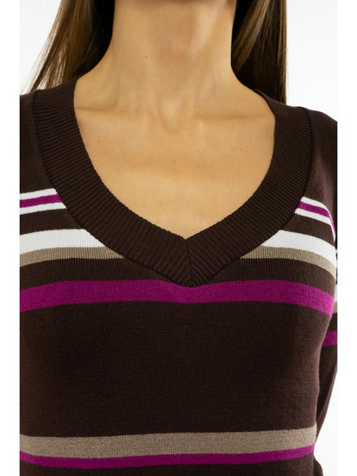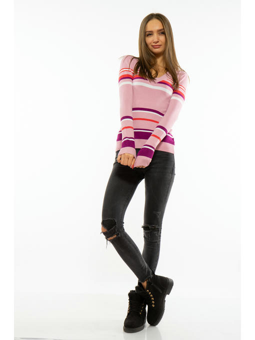 Выполненный из натуральной, хлопковой пряжи с добавлением небольшого процента ликры, женский свитер с горловиной V-образной формы, обладает гипоаллергенными свойствами и обеспечивает прекрасную посадку по фигуре. Яркие декоративные полосы, удачно дополняют стильный образ изделия.