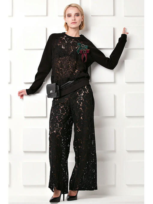 Роскошный кружевной свитшот из коллекции Opium Shine. Украшен двумя съемными брошами-бантами из корсажной ленты и страз. Дополнив свитшот умопомрачительными кружевными брюками P-26 и туфлями на каблуке, Вы получите великолепный праздничный наряд, в котором можно пойти в театр, в гости, в ресторан и произвести фурор! Спинка и рукава из плотного чёрного трикотажа немного приглушают парадность кружева, поэтому, сняв броши и добавив, например леггинсы Р-27 и удобную обувь, Вы получите небанальный комплект для повседневной жизни. Очень удачная вещь