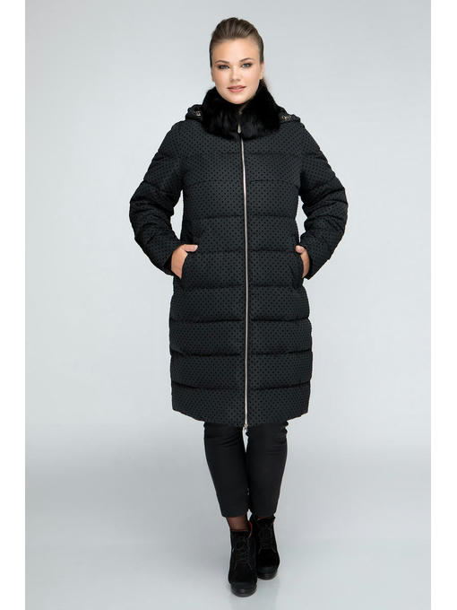 Пуховик из плащевки в горох. В модели присутствует воротник из натурального меха кролика и пристегивающийся капюшон. Утеплитель эко-пух. Два вшитых кармана. Изделие застегивается на двухстороннюю центральную молнию, что дает возможность растегивать молнию снизу для более комфортого движения. Подкладка из х/б. Сезон – зима.