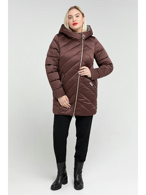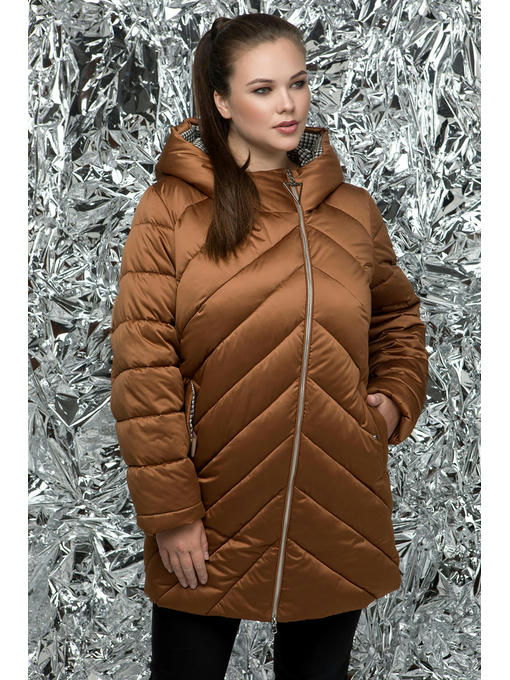 Пуховик из плащевой ткани двух цветов(первый – однотонный, а подкладка капюшона и карманов из клетчатой ткани). Два боковых кармана закрывающихся на кнопку, вшитый капюшон. Застегивается на молнию. Утеплитель – эко-пух, а подкладка из х/б.