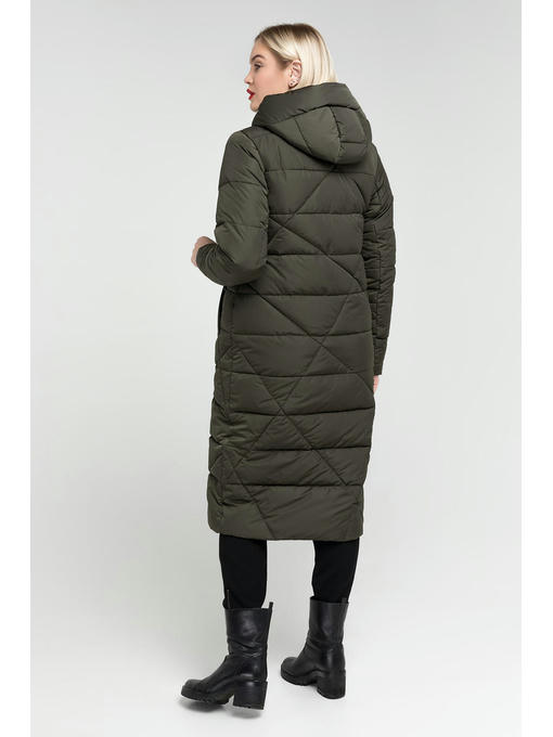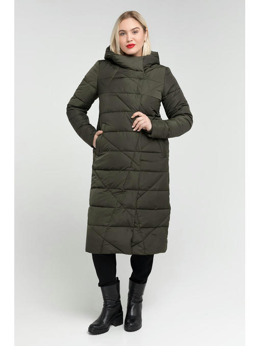 Пуховик в стиле одеяла. Геометрическая стежка добавляет в стиль свою изюминку. Застегивается на центральную молнию и кнопки. Есть два боковых кармана и втачной капюшон. Утеплитель – эко-пух.