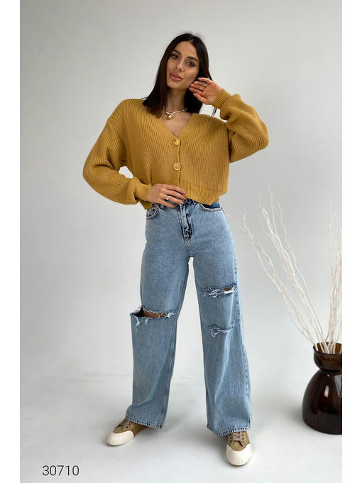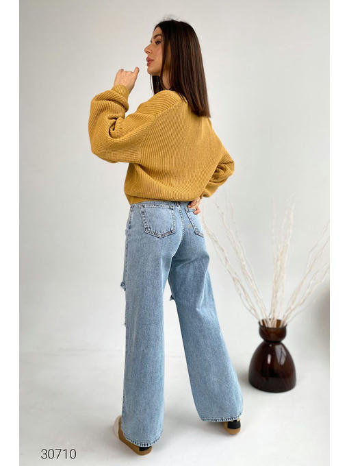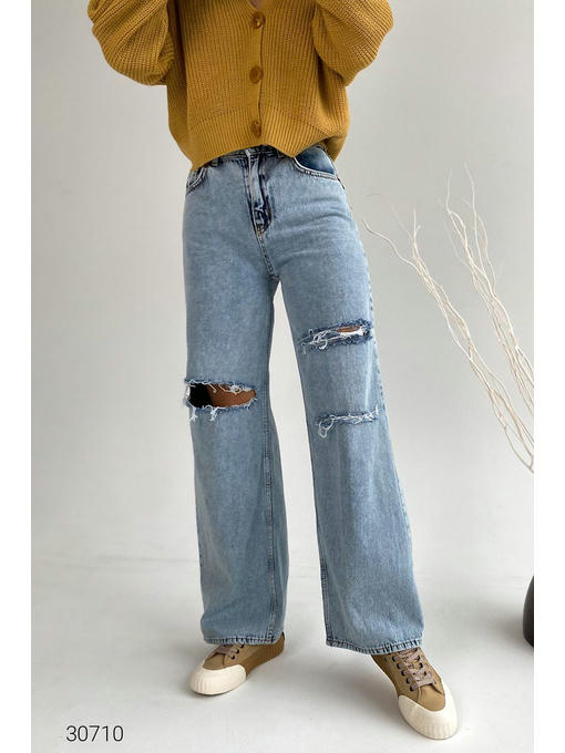 Джинсы из плотного качественного коттона, производства Турции. Завышенная талия, шлёвки, боковые прорезные карманы и накладные карманы сзади. Скрытая ширинка с застёжкой на молнию и пуговицу, разрезы с необработанными краями. Состав ткани: 100% – коттон.