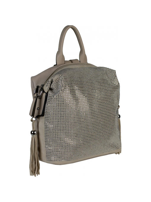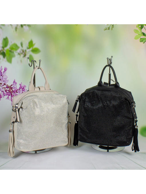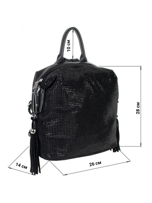Красивый рюкзак со стразами и кисточками из натуральной замши. Материал – комбинация эко кожи и искусственной замши. Аксессуары – никелированные. Одна короткая нерегулируемая ручка – петля. Высота ручки – 10 см. Дополнительно имеются две регулируемые лямки на спине. Рюкзак закрывается на молнию. На лицевой стороне рюкзак украшен большим количеством стразов, по бокам мягкие кисточки из натуральной замши. На задней стороне расположен горизонтальный прорезной карман на молнии. Внутри – тканевая подкладка, одно большое отделение, с задней стороны – два кармана на молниях, один – горизонтальный прорезной, второй – в виде перегородки, с лицевой стороны – карманы для мобильного телефона и для документов.
