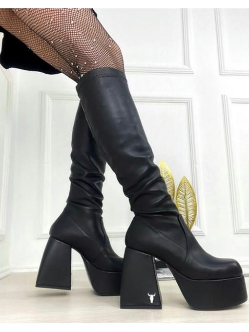 Сапоги на высоком каблуке с квадраным носком. Высота подошвы спереди: 5 см.; Высота каблука 11 см.; Высота от пятки 40 см.; Размерная сетка: 36-23,5; 37-24; 38-24,5 39-25,5; 40-26 см.