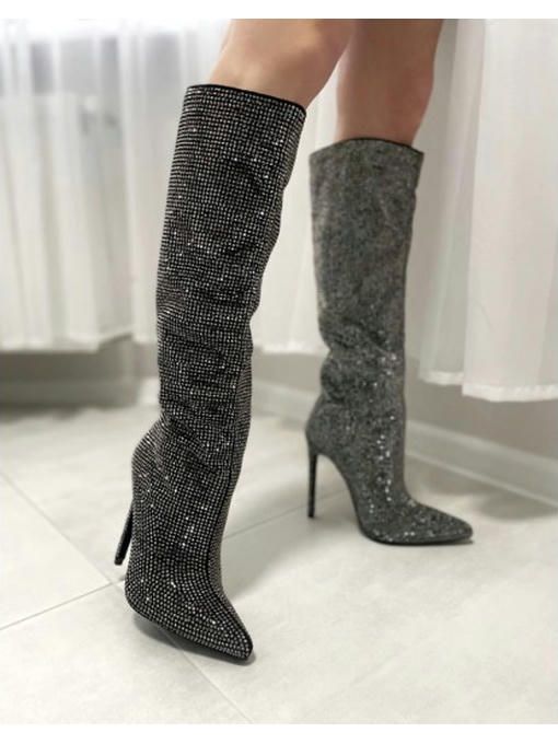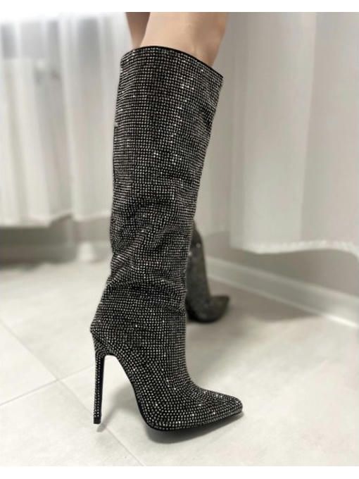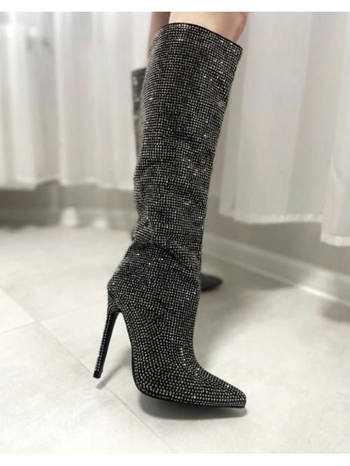 Чоботи на шпильке с стразами.Утеплены флисом по всей длинне. Высота каблука: 11,5 см. Высота от пятки 38 см. Размерная сетка: 36-23,5; 37-24; 38-24,5; 39-25,5; 40- 26; 41-26,5 см.