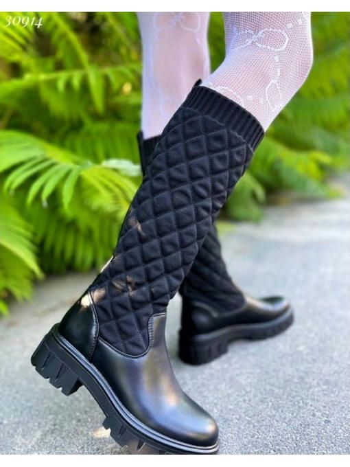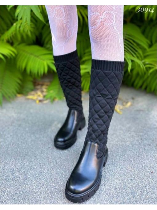 Сапоги с текстильной вставкой.Утеплены байкой. Высота подошвы спереди:3 см., высота сзади:5 см.Высота от пятки 34 см. Размерная сетка: 36-23,5; 37-24; 38-24,5; 39-25,5; 40- 26; 41-26,5 см.
