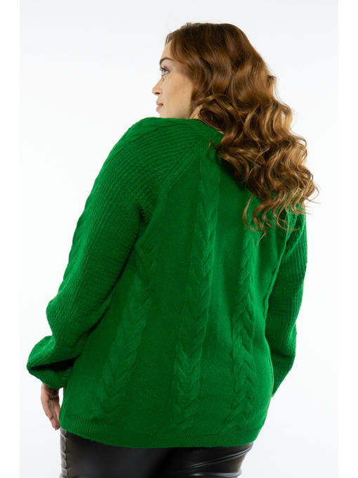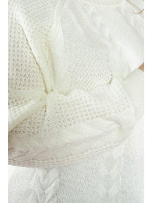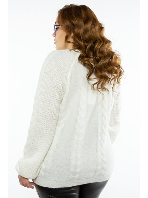 Стильный женский свитер свободного фасона, выполнен из пряжи в состав которой входит натуральная шерсть, кашемир и синтетические добавки. Такой состав, обеспечивает удобство в использовании и не требует сложного и специфического ухода. Декоративный узор вязки косичкой, в сочетании с рукавом типа реглан, удачно дополняют образ изделия.
