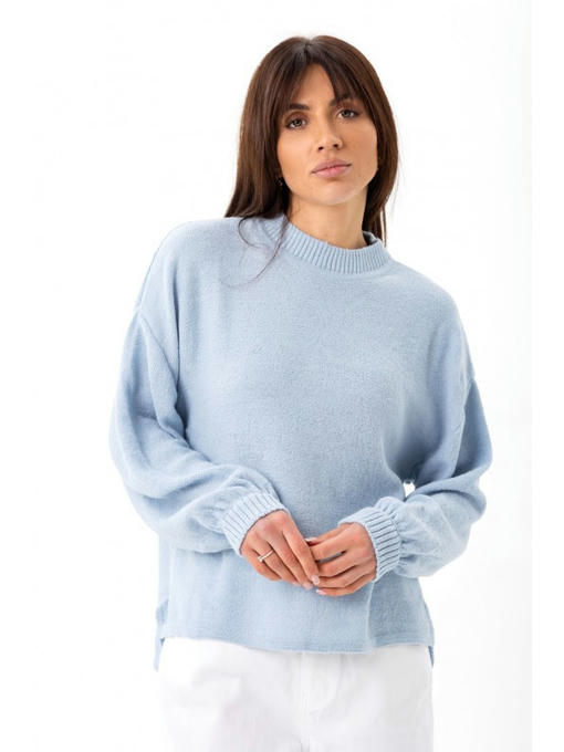Свитер с рукавами-фонариками делает образ женственным, кокетливым, изящным. Модель имеет круглый вырез, спущенные рукава с манжетами. Спинка немного длиннее лицевой сторонв. Легкий женский свитер широкого кроя производится в размерах XS-S и M-L.